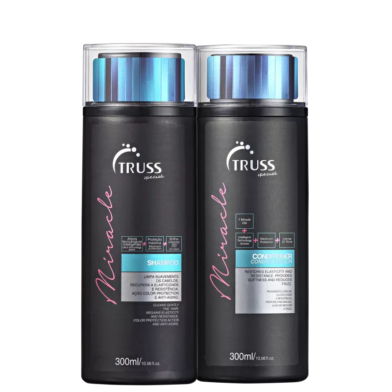 O Kit Truss Miracle Duo devolve a flexibilidade natural da fibra, acaba com o frizz e mantém os fios sedosos e suaves por muito tempo. O kit reúne produtos que recuperam a elasticidade dos fios e devolvem o movimento natural da fibra capilar. Deixam os cabelos ficam limpos, desembaraçados, macios e com brilho. Além disso, possui ação Anti-aging, tem pH fisiológico, forma filme de proteção duradouro e não tem adição de corantes.